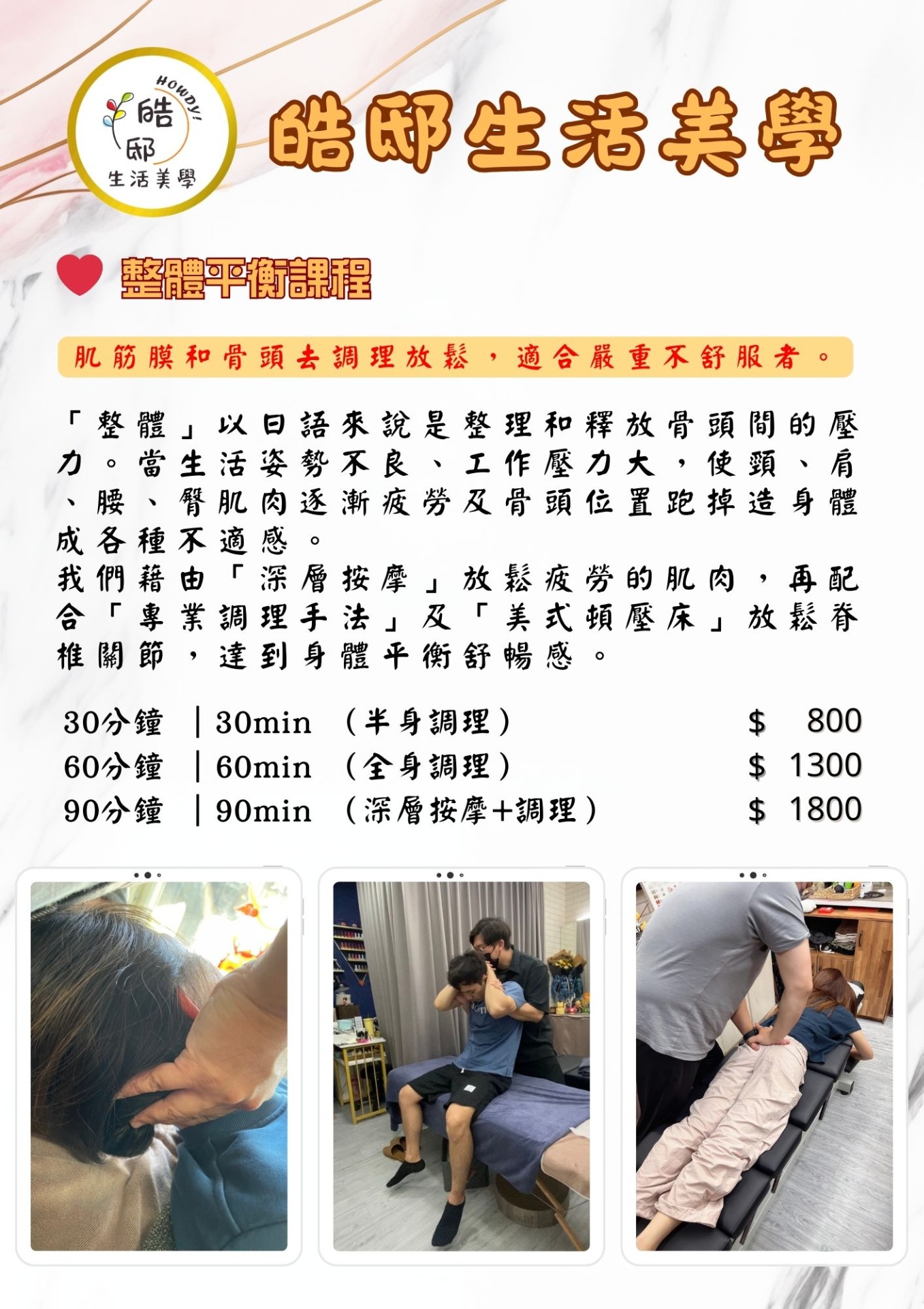 「整體」以日語來說是整理和釋放骨頭間的壓力。當生活姿勢不良、工作壓力大,使頸、肩、腰、臀肌肉逐漸疲勞及骨頭位置跑掉造身體成各種不適感。 我們藉由「深層按摩」放鬆疲勞的肌肉,再配合「專業調理手法」及「美式頓壓床」放鬆脊椎關節,達到身體平衡舒暢感,讓放鬆效果更持久。